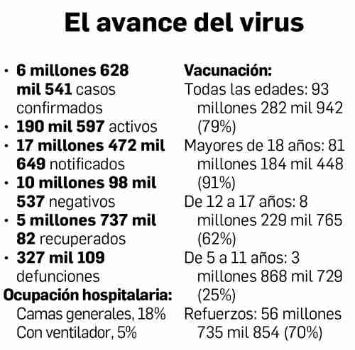 La Secretaría de Salud informó ayer de 4 mil 231 casos confirmados de covid-19 y 20 defunciones. El registro acumula 6 millones 628 mil 541 personas que han tenido el virus SARS-CoV-2 y 327 mil 109 fallecidos por complicaciones graves.