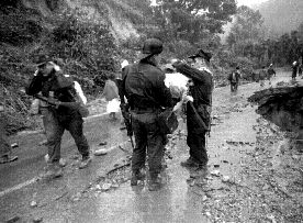 Integrantes de la policía estatal ayudan a un campesino a cargar los víveres que recibió en la ciudad de Zacapoaxtla, durante los patrullajes que realizan frente a los rumores de que la gente está siendo asaltada en los caminos. La gráfica, en las cercanías de Apulco, sobre la carretera interserrana Ť Foto: J. Guadalupe Pérez SINIESTRO
