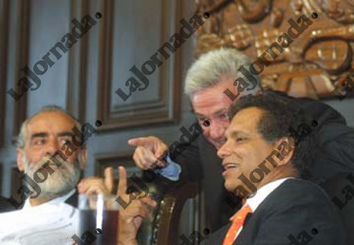 | Durante la sesion de la permanente en el Senado de la Republica,los senadores Diego Fernandez de Cevallos,Fidel Herrera y Sodi de la Tijera, se reunieron a comentar las iniciativas que se estaban presentando sobre el IVA a editores y sobre la sequia del pais,12 de junio de 2002.LA JORNADA/Luis Humberto Gonzalez |