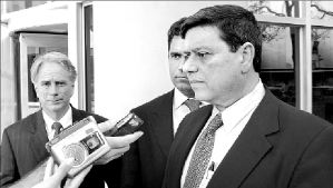 Rogelio Montemayor Seguy, ex director de Pemex, a su salida de la audiencia en una corte de Houston, Texas, en la que su defensa pidió aplazar la fecha de inicio del juicio de extradición. A la izquierda, el jefe de su equipo de abogados, Mike Degeurin FOTO NOTIMEX
