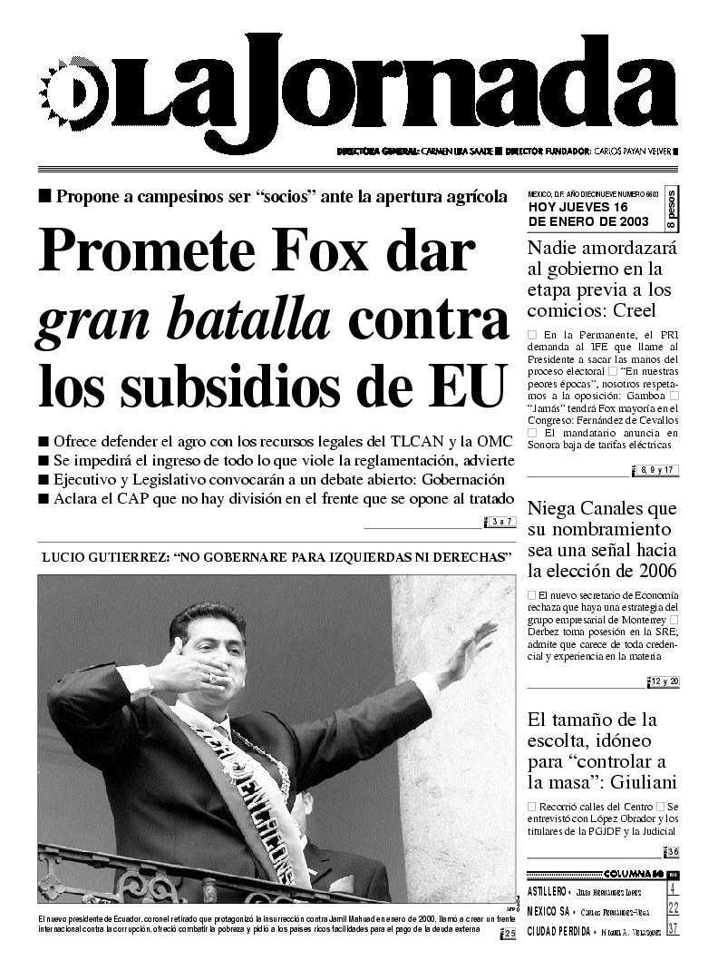 El nuevo presidente de Ecuador, coronel retirado que protagonizó la insurrección contra Jamil Mahuad en enero de 2000, llamó a crear un frente internacional contra la corrupción, ofreció combatir la pobreza y pidió a los países ricos facilidades para el pago de la deuda externa FOTO AFP