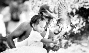 Padre e hija alimentan a una paloma en la