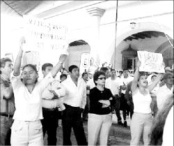 pancartas y mantas con frases como: "Fuera la comadre de Maricela". Cuando