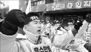 Empleados del banco KEB de crédito lanzan consignas durante una protesta realizada en Seúl contra la propuesta de fusionarse con otra institución FOTO AFP