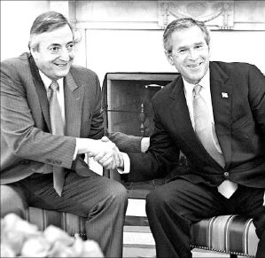 Los presidentes de Argentina, Néstor Kirchner, y de Estados Unidos, George Bush, durante un encuentro en la Casa Blanca en julio pasado FOTO AFP