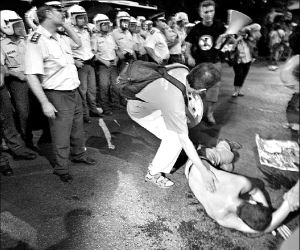 PROTESTAS Y REPRESION POR POWELL  Con pancartas que decían: "Powell fuera", "Estados Unidos fuera de Irak", unos 700 manifestantes antiglobalización se congregaron ayer en el centro de Atenas para protestar por la visita del secretario de Estado norteamericano, Collin Powell, quien asistirá el domingo a la ceremonia de clausura de los Juegos Olímpicos. Los protestantes tenían previsto desfilar frente a la embajada estadunidense, pero la policía los reprimió con gases lacrimógenos FOTO AFP