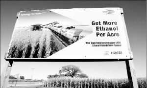Cerca de Feeport, Illinois, un cartel a orillas de un campo de maíz anuncia una variedad de semilla de maíz desarrollada para producir 4 por ciento más etanol que otras FOTO AFP