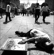 Indigente pide "una caridad" en el Zócalo, utilizando