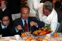 Mientras los comensales disfrutaban un menú de jugo de mandarina, frutas en platones, huevos al gruyere, pan y bizcochitos, el abanderado insistió en su discurso contra López Obrador.