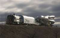 Una locomotora trasladó 3 kilómetros el conjunto de 39 metros, formado por el cohete y la nave, desde el centro de acoplamiento hasta la plataforma desde donde se realizará el lanzamiento este miércoles (jueves en Kazajstán).