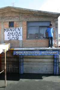 Valle de Chalco, Méx., 13 de febrero. “Manden ayuda SOS”, reza una manta colocada en la fachada de una casa de la avenida División del Norte, colonia San Isidro, que este sábado seguía inundada de aguas negras del canal La Compañía.