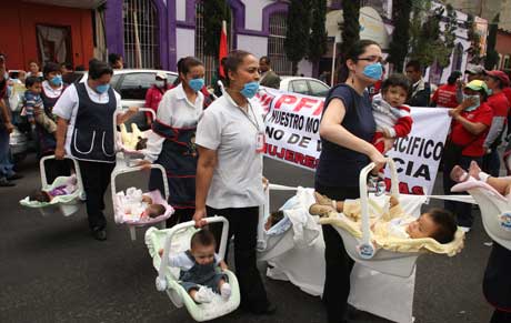 Integrantes de la Policía Federal dispararon los artefactos disuasivos contra electricistas que intentaban colocar banderas rojinegras en una subestación en la colonia Obrera. La acción afectó a una guardería subrogada del IMSS en la calle de Bolívar, donde 180 niños fueron desalojados y trasladados a una iglesia cercana. Una menor de ocho años y un recién nacido que estaban en la misma arteria fueron atendidos por irritación en ojos y síntomas de intoxicación. El SME encabezó ayer el paro cívico nacional en el Distrito Federal y en otros estados para exigir el respeto de derechos laborales, la reinstalación de trabajadores de Luz y Fuerza y la renuncia del secretario del Trabajo, Javier Lozano Foto Carlos R. Mamahua