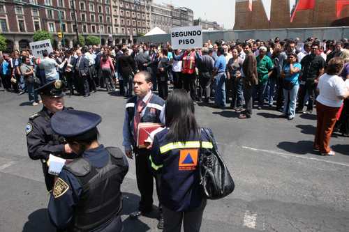 En punto del mediodía comenzó a escucharse el sonido de más de un centenar de silbatos alertando sobre el sismo de 8.1 grados de intensidad que segundos después se presentó. Miles de trabajadores y funcionarios salieron de sus oficinas ubicadas en los edificios del Gobierno del Distrito Federal y en 13 de las 16 delegaciones, dirigiéndose a los puntos de encuentro.