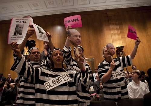 La sala de audiencias estaba llena de manifestantes, algunos vestían trajes de presidiarios y portaban carteles en los que se leía “Culpable” y “Goldman banksters(en referencia a gángsteres).”