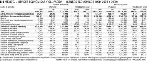 Comparando los tres censos económicos anteriores, las actividades de pesca y acuacultura perdieron -41 unidades económicas cada año entre 1998 y 2003, y -362 entre 2003 y 2008; las actividades industriales perdieron -3 mil unidades anuales en promedio entre 1998 y 2003, y crearon 23 mil anuales entre 2003 y 2008, y en los servicios se crearon 43 mil unidades por año entre 1998 y 2003, y 121 mil entre 2003 y 2008.