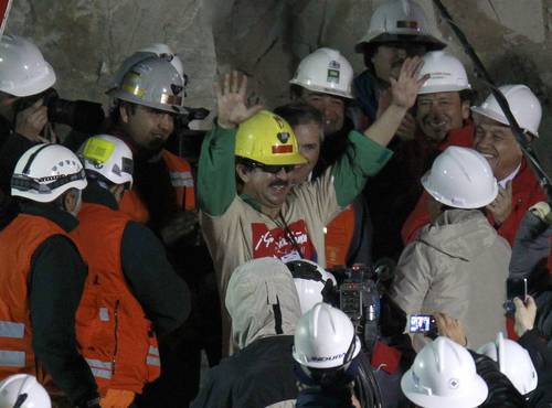Piñera llegó por la tarde a la mina San José. “Esta historia comenzó con una tragedia. Durante 17 largos y angustiosos días no sabíamos cómo estaban; pero nos hicimos un compromiso de no rendirnos jamás y lo hemos cumplido”, afirmó al referirse al operativo jamás realizado en la historia de la minería mundial.