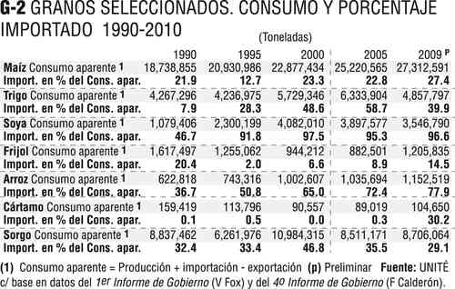El abandono en los años 80 del siglo anterior del principio de la autosuficiencia alimentaria y la apertura comercial nos han hecho cada vez más dependientes de los alimentos importados y con ello de sus alteraciones, vicios y nocividad. En 2009, 27.4% del maíz consumido en México fue importado, 39.9 del trigo, 96.6 de la soya, 14.5 del frijol, 77.9 del arroz y 30.2% del cártamo; y en forrajes, el 29.1% del sorgo (Gráfico 2).