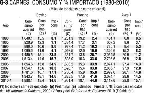 En carne de bovino éramos prácticamente autosuficientes en 1980 y en 2010 importamos 14.6% del consumo; de cerdo importábamos 2.4% y ahora 44.0; y de aves pasamos de la autosuficiencia en 1980 a importar 15.1 del consumo en este año (Gráfico 3).