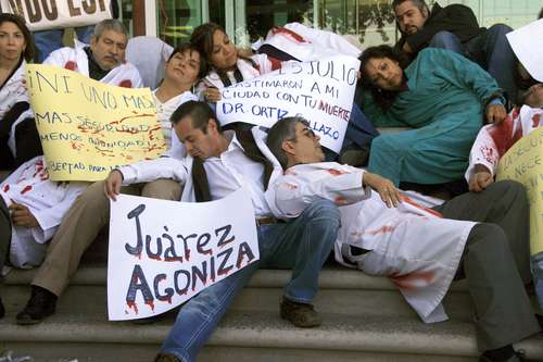 Ciudad Juárez, Chih., 13 de diciembre. Ciudad Juárez amaneció este lunes sin servicios médicos en clínicas y hospitales públicos y privados, debido a que su personal comenzó un paro de labores de 24 horas para exigir que las autoridades pongan freno a la ola de violencia e inseguridad que padece esta frontera y que ha afectado al gremio, pues en lo que va del año 11 médicos han sido secuestrados, dos de ellos fueron asesinados, y otros han sido víctimas de extorsiones.