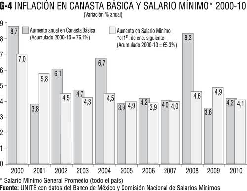 Con ello, entre el año 2000 y 2010 los precios de la Canasta Básica acumulan un incremento de 76.1% y el Salario Mínimo de 65.3%, esto es, una pérdida adquisitiva de 10.8 puntos o de 14.2% (Gráfico 4).