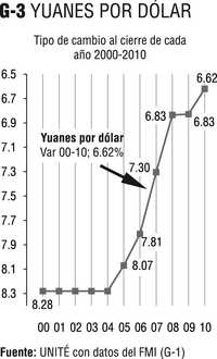 El yen japonés, por su parte, ha sido llevado en su liberalismo a una fuerte revaluación para quitarle competitividad; en 2001 se requerían 132 yenes para adquirir un dólar, en 2010 sólo 81 (Gráfico 4).
