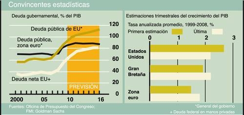 Un tercer tratamiento cosmético es la forma en que se publican las cifras trimestrales del PIB. Los boletines de prensa en Europa miden el incremento del PIB durante el trimestre más reciente, digamos una elevación de 0.9%. En cambio los estadunidenses anualizan el crecimiento trimestral, por lo que un incremento idéntico se anunciaría como una tasa de 3.6%, que suena más impresionante. Mucho más importante: las estimaciones iniciales del crecimiento del PIB en las economías europeas tienden a ser más cautelosas que las de EU. Kevin Daly, economista de Goldman Sachs, estima que durante los 10 años que concluyeron en 2008, la tasa de crecimiento trimestral del PIB en EU se revisaba a la baja en unos 0.5 puntos porcentuales anualizados en promedio entre la primera estimación y la última publicadas. En contraste, las cifras del PIB en la zona euro fueron revisadas al alza en un promedio de 0.3 puntos. Esto importa porque los mercados financieros y los medios se enfocan fuertemente en el primer estimado, pero en buena medida pasan por alto las revisiones hechas años después.