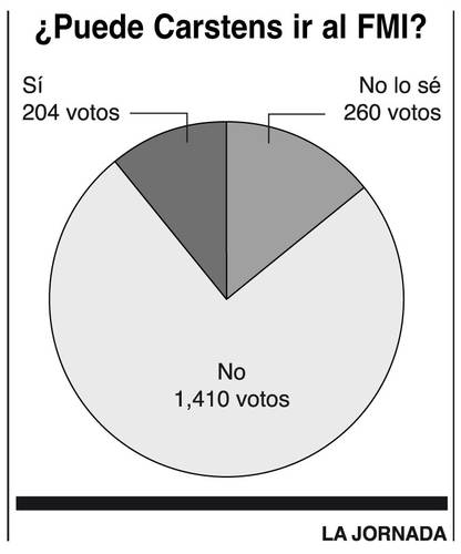 n nuestra encuesta semanal abordamos el tema del Fondo Monetario Internacional y las posibilidades que tiene Agustín Carstens de vencer a su contrincante, la francesa Christine Lagarde. Los votos se conformaron de la siguiente manera: 76 por ciento no cree que tenga posibilidades. El 11 por ciento considera que sí. Y 14 por ciento aportó distintos puntos de vista.