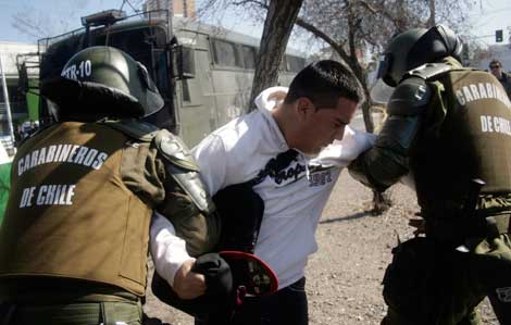 Un manifestante es detenido por la policía en Santiago al continuar las protestas en demanda de mejoras en la enseñanza pública. El presidente chileno, de manera unilateral, firmó ayer la Ley de Aseguramiento de la Calidad de la Educación que, a su juicio,