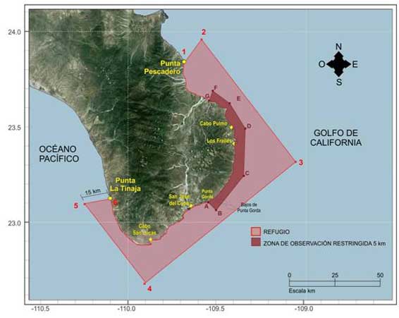 Por esta razón, la Semarnat, considerando el acuerdo por el que se establece como área de refugio para proteger a las especies de grandes ballenas de los subórdenes Mysticeti y Odontoceti, las zonas marinas que forman parte del territorio nacional y aquellas sobre las que la nación ejerce su soberanía y jurisdicción, determinó elaborar el Programa de Protección Regional de la Ballena Jorobada en el sur del Estado de Baja California Sur en el Área de Refugio de la Ballena Jorobada en la Región de Los Cabos, Baja California Sur, que abarca desde la punta La Tinaja en la costa occidental de la península al noroeste de cabo San Lucas hasta punta