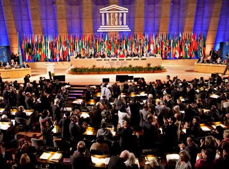Delegados de la Organización de Naciones Unidas para la Educación, la Ciencia y la Cultura (Unesco) se congratulan tras el respaldo de más de un centenar de países al ingreso de Palestina como miembro con plenos derechos en el organismo internacional, durante una votación nominal en la 36 Conferencia General en París. Entre los sufragios favorables figuran los de casi todos las naciones latinoamericanas, excepto México Foto Ap