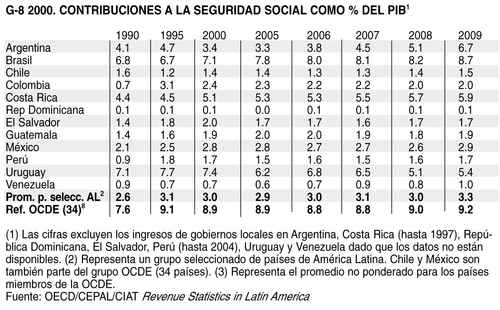 Partida 2000. Las contribuciones a la seguridad social en América Latina también muestran un avance marginal al pasar del 2.6% del PIB en 1990 al 3.3 en 2009 (Gráfico 8). La mayor captación corresponde a Brasil con 8.7% del PIB, Argentina, 6.7; Costa Rica, 5.9, y Uruguay, 5.4; y la menor corresponde a Chile, 1.5; Venezuela, 1.0, y República Dominicana, 0.1%.