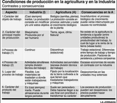 ntre las muchas cuestiones interesantes que surgieron en el Seminario Internacional sobre Pobreza y Persistencia Campesina en el Mundo Contemporáneo celebrado la semana pasada en El Colegio de México, destaca el papel de los rasgos distintivos de la actividad agrícola en contraste con las industriales. Henry Bernstein1 sintetizó en un cuadro las diferencias destacadas en el documento de base del seminario (de mi autoría). Por otra parte, durante mi lectura previa al seminario, la presentación verbal y la discusión posterior de la ponencia de Armando Bartra2, me cayó el veinte que hay una diferencia que no incluí: el contraste entre el carácter de la maquinaria, principal medio de producción en la industria (I) y de la tierra, agua y clima (naturaleza), principal medio de producción en la agricultura (A). La maquinaria es producida por el ser humano y puede por tanto ampliarse (y modificarse) a voluntad; en cambio, la naturaleza sólo se puede modificar dentro de ciertos límites y no se puede ampliar (si bien se pueden incorporar tierras al cultivo, el planeta es finito al igual que la superficie potencialmente cultivable). Partiendo del cuadro de Bernstein, añadiéndole este rasgo y una columna de consecuencias y haciéndole otros cambios he llegado al cuadro aquí incluido. He puesto en sus dos primeros renglones los rasgos referidos al carácter del objeto de trabajo y del principal medio de producción en la I y en la A. Con ello se resalta que tanto el objeto de trabajo como el principal medio de producción son naturales en la agricultura. Que la producción agrícola consiste en provocar, estimular y cuidar el crecimiento biológico de plantas, en agudo contraste con la mayor parte de las actividades industriales, lo cual se refleja en el tercer renglón: la discontinuidad del proceso de trabajo en la agricultura, pues como dijo Marx en El Capital, después de la siembra, el proceso de trabajo se interrumpe casi por completo y el producto no terminado se abandona al influjo de procesos naturales. Mientras el segundo renglón se refiere al rasgo de la agricultura que explica el surgimiento de la renta de la tierra agrícola (que narré en la entrega del 9/3/12 y que para Bartra explica la persistencia campesina), el carácter no producido de tierra, agua y clima, el tercer renglón resalta el carácter estacional de la agricultura que, para mí, explica tanto pobreza como persistencia campesina. Los tres últimos renglones añaden rasgos de la agricultura contrastados con la industria, que explican el papel menor de las economías de escala en la agricultura y, por tanto, su menor tendencia a la concentración de la producción. (Véase en la gráfica la concentración de la tierra agrícola en México en 2007).
