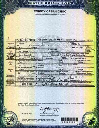 Un nombre aparece desde el acta original expedida en el Condado de San Diego, estado de California. Se señala que nació el 25 de junio de 1952 en el Mercy Hospital de esa ciudad, con nacionalidad estadunidense.