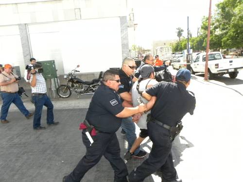 Hermosillo, Son., 25 de mayo. Policías municipales detuvieron a dos integrantes del Movimiento Ciudadano por la Justicia 5 de Junio que se manifestaban en el centro de la ciudad, denunciaron voceros del grupo, integrado por padres de los niños que fallecieron en el incendio de la guardería ABC el 5 de junio de 2009.