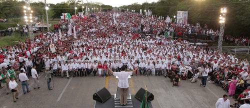 En la concentración, que abarcó casi dos kilómetros de la vía ubicada al sur de la capital de la entidad, estuvieron presentes la mandataria estatal, Ivonne Ortega, y los candidato priístas a gobernador, Rolando Zapata Bello, y a alcalde de Mérida, Nerio Torres. En contraste con otros mitines, esta vez se permitió que estos dos últimos pronunciaran un discurso como parte de sus respectivos cierres de campaña.