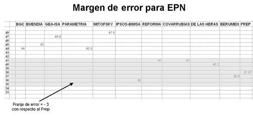 Significativamente, sólo una de las encuestadoras (Berumen) pronosticó un margen menor para Peña Nieto respecto de López Obrador. Todas las demás dieron al mexiquense márgenes mucho más holgados que el que indican los resultados oficiales. Corresponderá a los encuestadores y a los medios asociados a ellos explicar tal coincidencia.
