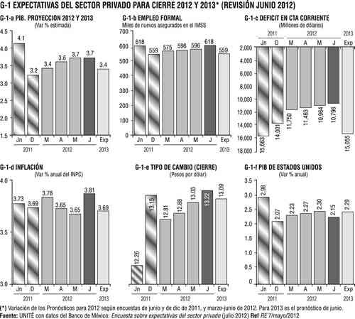 Inflación.- El crecimiento del Indice Nacional de Precios al Consumidor la ubican en 3.8% para este año (Gráfico 1-d), predicción harto optimista considerando que al cierre de junio el incremento anual (últimos 12 meses) acumula ya 4.34%. Para 2013, la predicción promedio estima una inflación general para el consumidor de 3.69%.