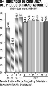A partir de la Encuesta de Opinión Empresarial, el INEGI elabora el Indicador de confianza del productor manufacturero (2003 = 100), mismo que tras su desplome por la crisis de 2008-09, en los últimos dos años se mantiene relativamente estable, si bien a la mitad de su nivel de 2003: en junio de 2010 se ubicó en 56.1 puntos, en 2011 en 57.1, y en junio de 2012 en 53.9 puntos (Gráfico 4).