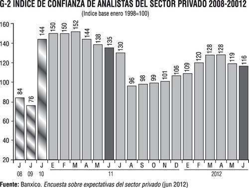 En este marco, los analistas privados evalúan la situación económica actual respecto a seis meses atrás y a su expectativa para los próximos seis meses, cuyo balance de respuestas configura el Indice de confianza de los analistas del sector privado (base 1998=100), mismo que muestra una confianza decreciente en los últimos dos años: en junio de 2010 se ubicó en 144 puntos, en junio de 2011 en 135, y en junio de 2012 en 116 puntos (Gráfico 2).