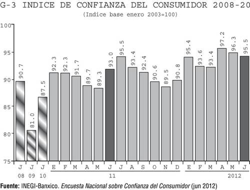 Con una tendencia distinta, aunque sin mucha consistencia, el Indice de confianza del consumidor (2003=100) se ubicó en junio de 2010 en 87.5 puntos, en junio de 2011 en 93.0, y en junio de 2012 en 95.5 (Gráfico 3). Este indicador incluye las percepciones de los hogares de la situación económica actual respecto a un año antes y a un año después, sobre la situación económica del país, y respecto a la posibilidad presente de comprar bienes duraderos.
