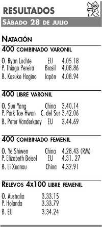 El inicio de la natación confirmó la irrupción de China, que sumó dos medallas doradas, su primera entre los hombres con Sun Yang en los 400 metros libre, y la segunda con récord mundial incluido, gracias a Ye Shiwen en 400 metros combinado femenil.