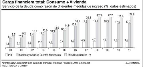 La proporción del sueldo que las familias mexicanas destinan al pago de sus deudas por el uso de préstamos al consumo y a la vivienda se triplicó en sólo una década, según datos oficiales citados en un estudio elaborado por BBVA Bancomer, el principal intermediario financiero del país.