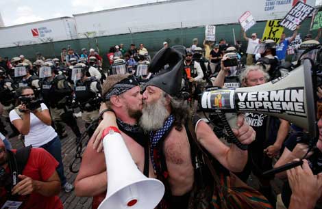 Bajo una férrea vigilancia policiaca, grupos de manifestantes se congregaron en las cercanías del inmueble donde abrió ayer el encuentro republicano. Ahí se designará formalmente a Mitt Romney y Paul Ryan candidatos a presidente y vicepresidente de Estados Unidos. Este último destaca por sus recetas económicas para desmantelar lo que queda del estado de bienestar, reducir el gasto social e incrementar el de defensa, así como disminuir los impuestos a los estratos de mayores ingresos Foto Ap
