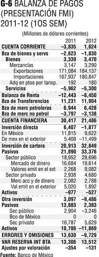 Si bien en Reporte usamos la presentación histórica del Banco de México para Balanza de Pagos por su calidad analítica, dado el interés de algunos lectores, incluimos también el formato impuesto por el Fondo Monetario Internacional (Gráfico 6).