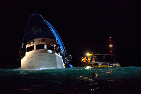 Rescatistas buscan sobrevivientes en uno de los navíos en el momento en que se va a pique. En la embarcación que zozobró viajaban más de 120 personas y tripulantes que iban a presenciar un espectáculo nocturno de fuegos artificiales con ocasión de la fiesta nacional china en el puerto Victoria, cerca de la Isla Lamma. La policía indicó que desconocía las causas del percance Foto Reuters