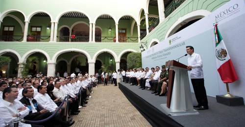 Mérida, Yuc., 21 de diciembre. La reforma educativa aprobada por el Congreso será para emprender mejoras y cambiar lo que ya no funciona en el sistema de enseñanza y no pretende “conculcar los derechos de nadie”, aclaró el presidente Enrique Peña Nieto. Felicitó a los legisladores y dijo confiar en una pronta y consecuente respuesta de las legislaturas de los estados para materializar cuanto antes el impulso a la calidad de la educación “que se necesita”.