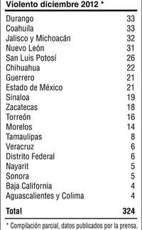 l presidente Obama suspendió sus vacaciones y volvió a Washington en vísperas de Año Nuevo a dar seguimiento a las negociaciones de los líderes del Congreso en torno al peliagudo asunto del precipicio fiscal. Valió la pena. Hay un arreglo inicial, está en proceso de ser avalado por la Cámara de Representantes, dominada por republicanos. El presidente Peña Nieto suspendió sus actividades oficiales y se fue de vacaciones familiares a Acapulco, no obstante que su primer diciembre en el gobierno resultó terriblemente violento. No hay cifras confiables para hacer un comparativo con años anteriores, pero deja la impresión de que fue uno de los peores. Un recuento somero, incompleto, del número de personas que perdieron la vida en sucesos relacionados con el crimen arroja la cifra de 324. Sobresale la matanza en el penal de Gómez Palacio, Durango. Por otro lado, sería infructuoso tratar de contabilizar las pérdidas materiales: negocios incendiados, empresarios extorsionados, transportistas secuestrados. Resultaría un contrasentido exigir al nuevo gobierno que en un solo mes devolviera algo de paz a la República. Pero Peña Nieto perdió la oportunidad de dar a la opinión pública una impresión distinta. Diciembre estuvo de principio a fin a merced de las mafias. Ya se está agotando la coartada del panismo de que el origen del problema reside en que somos vecinos del principal consumidor de drogas. Media docena de entidades permiten el consumo de mariguana para pasar un good time, un buen rato, no sólo para uso medicinal. Producirán su propia mariguana, no tendrán que seguir importándola de México, al menos no toda.