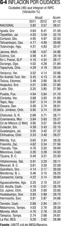 De las 46 ciudades donde se registran los precios para inte- grar el INPC, las que en el sexe-nio acumularon los mayores incrementos fueron: Jacona 35.0, Tulancingo 33.5, Veracruz 32.7, Culiacán 32.1, y Cortazar 32.0% (Gráfico 4). Las de menores aumentos fueron: Tampico 24.6, Monclova 24.0, Cd Juárez 23.6, Tijuana 23.3, y Mexicali 22.6%.