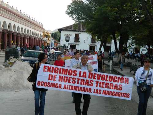 San Cristóbal de Las Casas, Chis., 9 de febrero. Más de 200 pequeños propietarios desplazados de los municipios de Ocosingo, Altamirano y Las Margaritas marcharon en esta ciudad para exigir a los gobierno federal y estatal garantías para regresar a sus ranchos o el pago correspondiente a las 41 mil hectáreas invadidas.