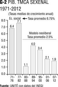 En retrospectiva, en 2012 México completó también cinco sexenios de neoliberalismo económico, tres décadas perdidas de crisis recurrentes en que el crecimiento se desplomó de un promedio de 6.75% anual entre 1971 y 1982, a 2.5% entre 1983 y 2012 (Gráfico 2).